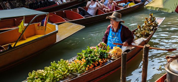 這趟水上之旅,長方形彩色木筏載滿五顏六色水果、由戴著斗笠婦女搖槳緩前、錯落在綠色的運河上,這是歐美中外人士旅泰指標,是最接近泰人水上傳統生活型態的回顧;沿岸不妨一路吃喝買玩、小吃、水果皆物美價廉到神仙也下凡