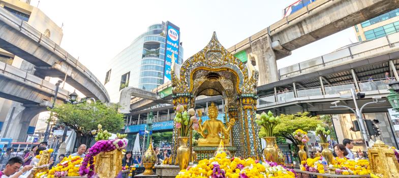 您可自由參拜四面佛,或前往東南亞最大最具時尚領導風格的中央世貿商場,這是間三大百貨連成的購物中心。其中以泰絲及NaRaYa 曼谷包最受台灣觀光客青睞。還有一個BIG C 商場,伴手禮最佳選擇就在這裡。