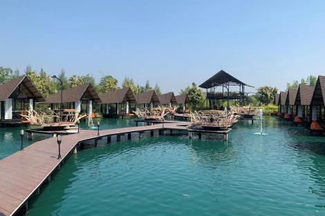 被譽為迷你版馬爾地夫,到處充滿著海島風的景象,怎麼拍都好看,斜頂式的建築一座座拍過非常驚艷。店裡最熱門的就是這猶如蓮花的圓形座位,傍晚點起燈來也是一個拍點,天色昏暗卻充滿宛如星光的步道,想拍網美照的必遊。