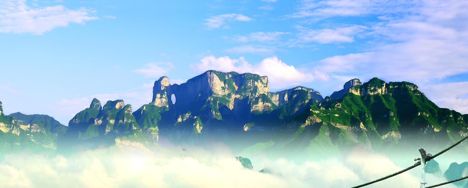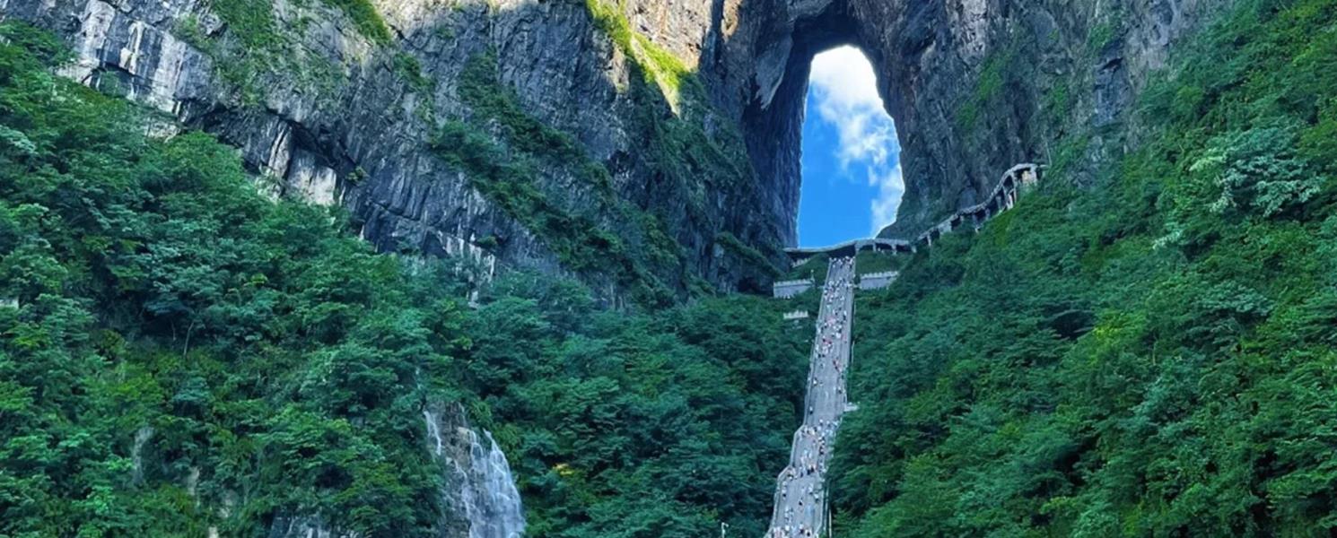 天門洞是世界最高海拔的天然穿山溶洞,南北對開於千尋素壁之上,扶搖而通天,氣象變化萬千,似明鏡鑲嵌於蔚蔚天幕之上,終年白雲紫霧,氤氳蒸騰,氣勢磅礴,巍峨高絕,是世界罕見的高海拔天然穿山溶洞。