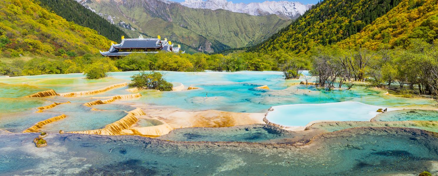 黃龍溝被譽為「人間瑤池」,由黃龍溝、丹雲峽、牟尼溝、雪寶鼎、雪山梁、紅星岩、西溝等景區組成;黃龍以彩池、雪山、峽谷、森林四絕著稱,其獨特的地貌特徵是山雄峽峻、角峰如林、峽谷縱橫、崖壁陡峭,絕美景觀猶如人間仙境。