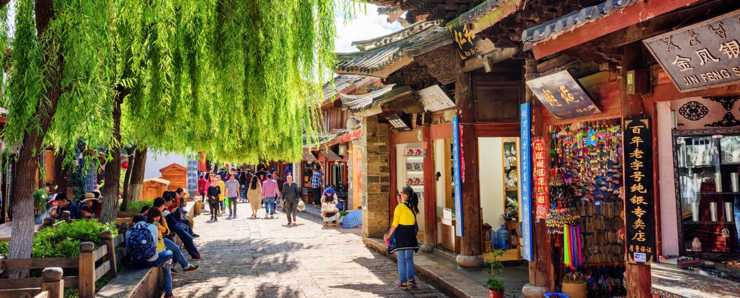 束河依山傍水、民居房舍錯落有致,街頭有一潭水,稱為九鼎龍潭、又稱龍泉,潭周綠柳垂地、翠柏指天,泉水清澈、游魚可數,潭中溢出的流水蜿蜒於村中道旁;街面上的那些被人馬踩踏得光溜平滑的石板,似乎還能照見往日的繁華。