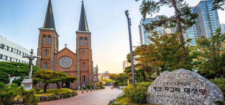 桂山聖堂,原始教堂建於1891年,後於1902年由法國神父羅伯特重建,並於1918年擴建鐘塔。建築融合哥德式與羅馬式風格,採紅磚、黑磚與花崗岩打造,呈拉丁十字形布局,擁有八角形尖塔和彩繪玻璃窗,是嶺南地區首座西洋式聖堂。