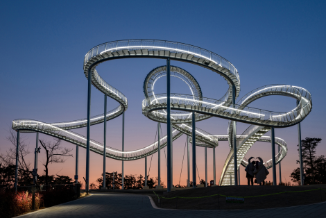 刺激體驗!SPACE WALK用走的雲霄飛車,步道長333公尺,階梯數共有717階,以不銹鋼打造的天空步道,優雅的曲線與美麗的夜間照明,是鐵與光之都浦項的象徵。在此可以俯瞰360度周邊美景。